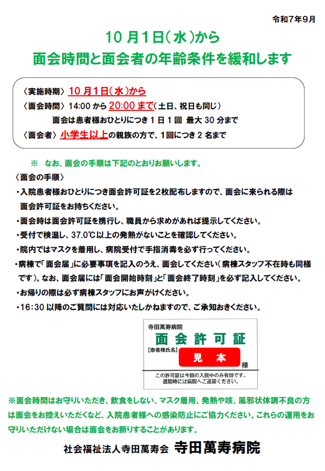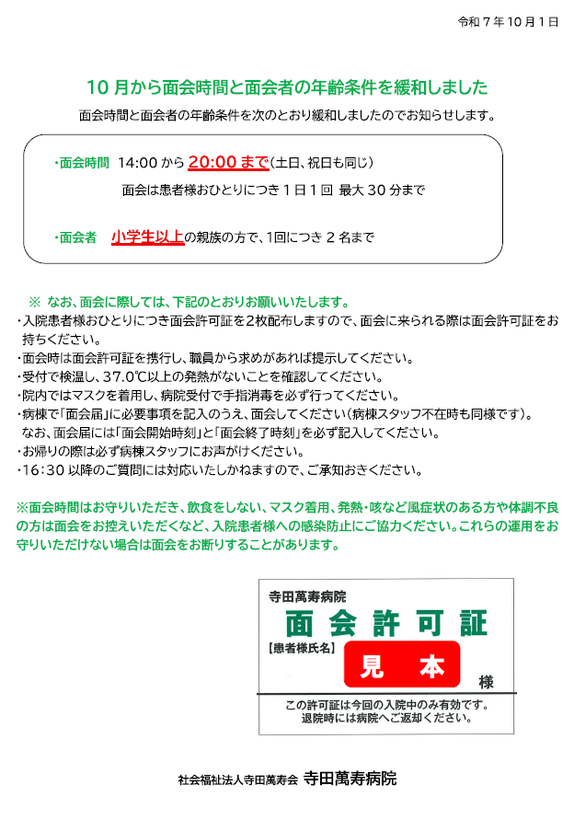 10月1日より面会時間等を下記のとおり緩和いたしました。